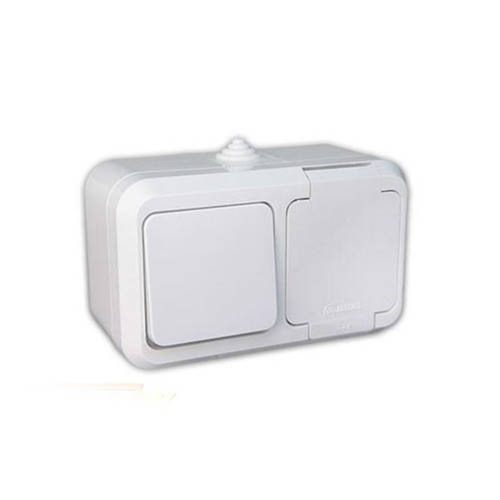 Выключатель одноклавишный + розетка с заземлением и крышкой белая ІР-44 Makel 18350